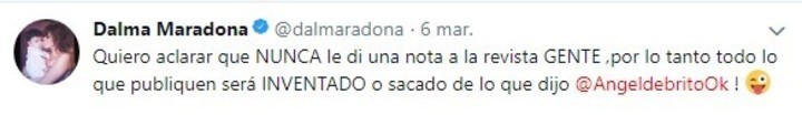 Lo cierto es que la hermana mayor de Gianinna (28) desmintió absolutamente todo. “Quiero aclarar que NUNCA le di una nota a la revista GENTE. Por lo tanto todo lo que publiquen será INVENTADO o sacado de lo que dijo Ángel de Brito”, tuiteó la primogénita del ex capitán de la Selección Argentina.