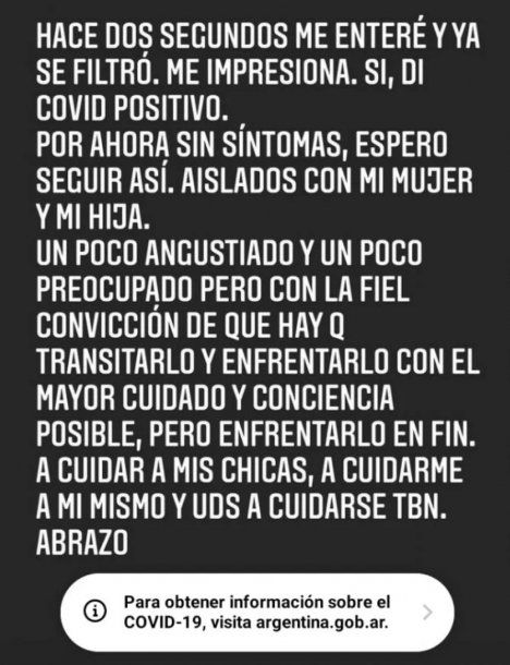 “Estoy un poco angustiado y un poco preocupado pero con la fiel convicción de que hay que transitarlo y enfrentarlo con el mayor cuidado y conciencia posible, pero enfrentarlo en fin. A cuidar a mis chicas, a cuidarme a mí mismo y ustedes a cuidarse también. Abrazo“, contó en una publicación de Instagram luego de trascendiera en las redes su infección.
