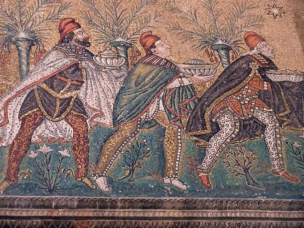 Sus nombres, Melchor, Gaspar y Baltasar, aparecieron por primera vez en un mosaico dentro de un templo de Italia. Se trata de una obra que data del siglo VI ubicada en la iglesia de San Apollinaire Nuovo, en Rávena. Allí se distingue a los tres magos ataviados al modo persa con sus nombres encima y representando distintas edades.