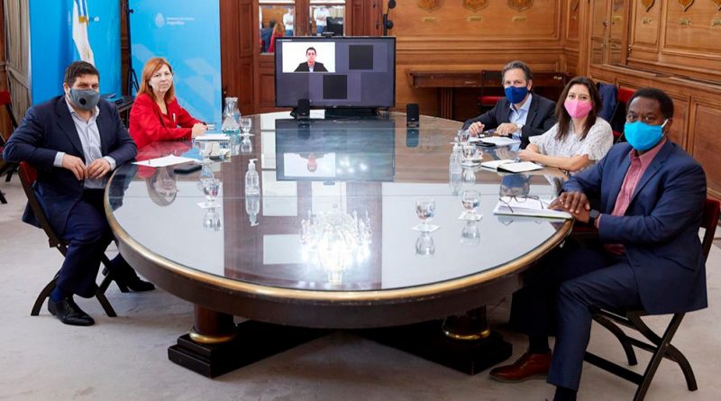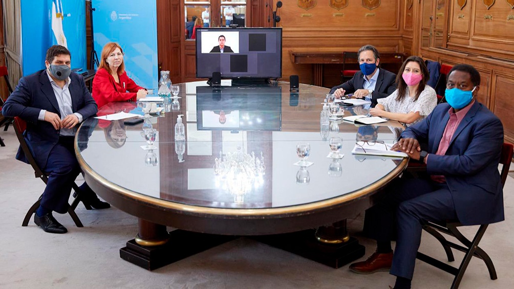 El encuentro se realizó con los representantes del organismo de crédito presentes en la Casa Rosada, mientras que el ministro del Interior lo hizo a través de forma remota por encontrarse cumpliendo aislamiento preventivo por ser considerado contacto estrecho del secretario de Asuntos Estratégicos de la Presidencia, Gustavo Béliz, quien ayer dio positivo en coronavirus.