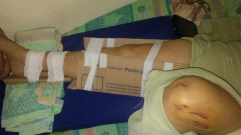 La gravedad de las lesiones demandaba la inmediata inmovilización de su pierna derecha, pero ante la falta de insumos y elementos de ortopedia en el hospital, el personal debió ingeniárselas e improvisó una rudimentaria “férula” con cartones y cinta adhesiva.