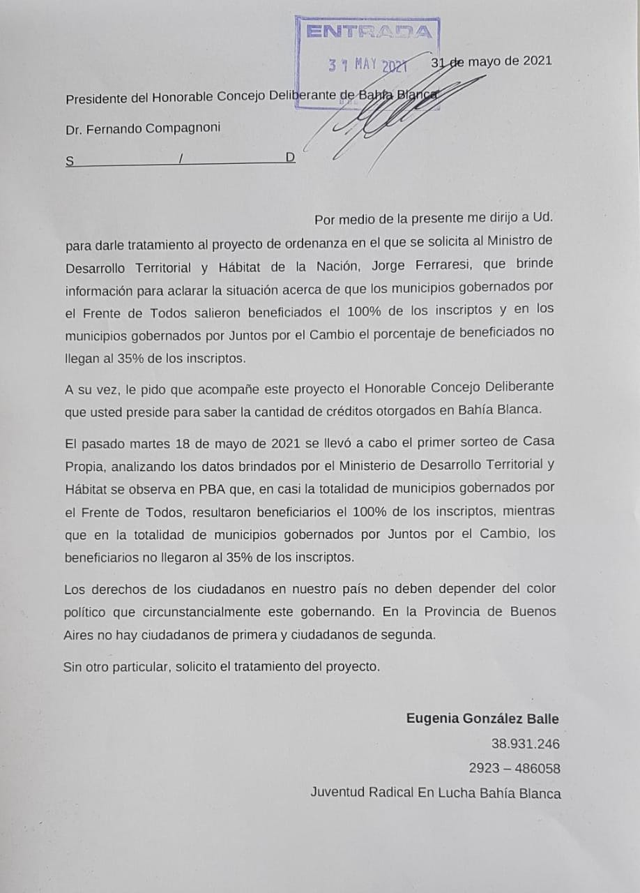 En ese sentido, el espacio político presentó un proyecto de ordenanza en el Concejo Deliberante en el que solicita que el ministro de Desarrollo Territorial y Hábitat de la Nación, Jorge Ferraresi, brinde información sobre la cantidad de créditos otorgados en Bahía Blanca.