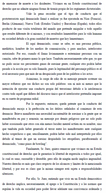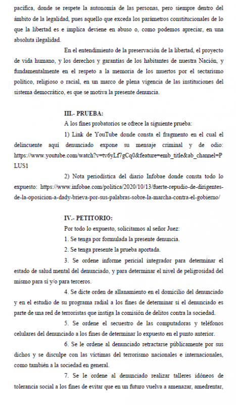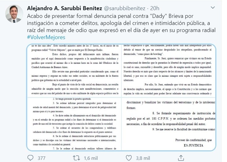 Ante la presunta disculpa que pueda presentar Brieva sobre sus dichos, Benitez aclara: “El aquí denunciado, como se sabe, es una persona pública, mediática, hombre de los medios de comunicación, y para muchos, interlocutor autorizado. Por eso, cuando él llama livianamente a exterminar personas con un camión, sabe de primera mano lo que hace”.
