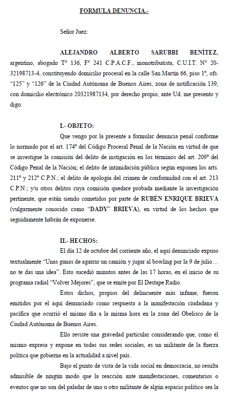 Se trata de Alejandro A. Sarubbi Benítez, quien acusa a Brieva de haber cometido instigación al delito (art. 209 del Código Penal); intimidación pública (arts. 211 y 212) y apología del crimen (art. 213).