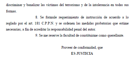 Vivimos en un Estado constitucional de derecho que le garantiza la libertad de expresión a todos por igual, lo cual es sano, razonable y deseable, pero ello de ningún modo implica impunidad”, cerró el abogado.