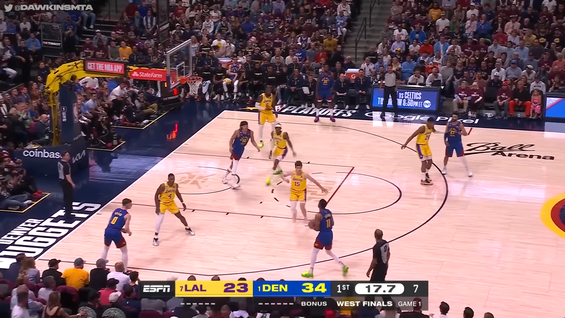 Denver Nuggets (1) se impuso por 132-126 a Los Angeles Lakers (0) en la noche del martes en la primera final de la Conferencia Oeste de la NBA de básquetbol.