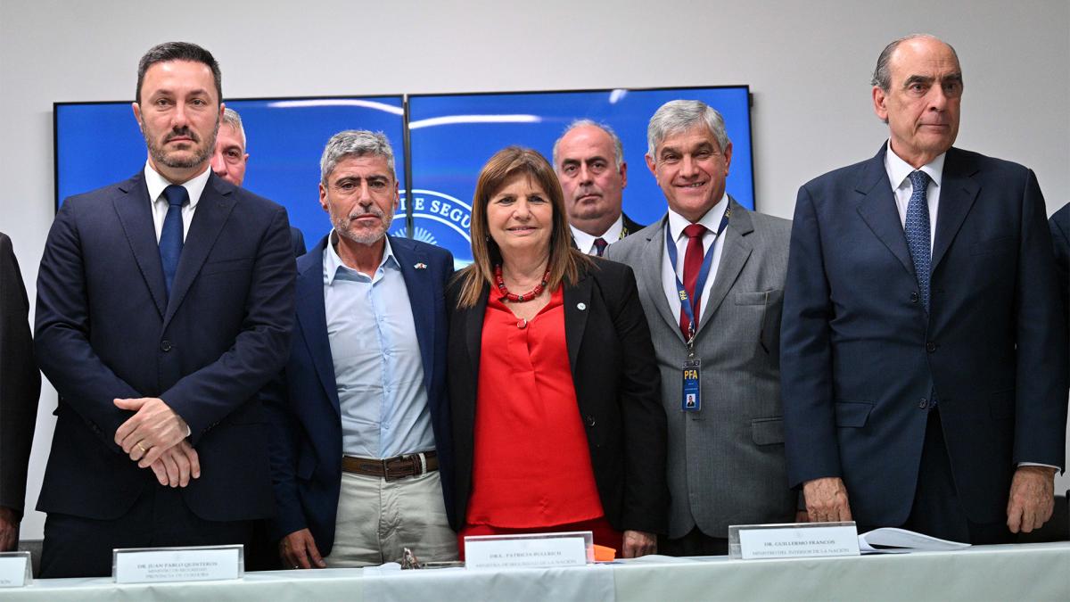 Junto a Bullrich participaron de la conferencia de prensa el ministro de Seguridad de Córdoba, Juan Pablo Quinteros, y los ministros nacionales de Interior y Defensa, Guillermo Francos y Luis Petri, respectivamente.