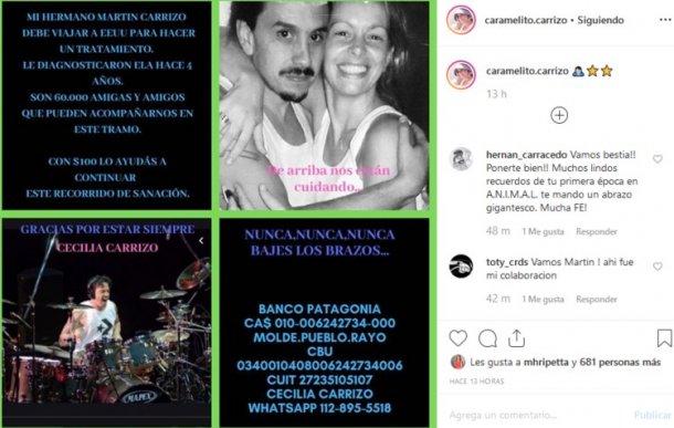 La conductora inició una campaña en las redes para juntar fondos: “Mi hermano Martín Carrizo debe viajar a EEUU para hacer un tratamiento. Le diagnosticaron ELA hace 4 años. Son 60.000 amigos y amigas que pueden acompañarnos en este tramo. Con 100 pesos cada uno lo ayudás a continuar este recorrido de sanación“.