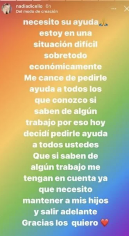“Necesito su ayuda. Estoy en una situación difícil, sobretodo económicamente. Me cansé de pedir ayuda a todos los que conozco; de preguntarles si saben de algún trabajo… Por eso, hoy decidí pedirles ayuda a todos ustedes… Si saben de algún trabajo ténganme en cuenta ya que necesito mantener a mis hijos y salir adelante. Gracias, los quiero“, expresó, muy preocupada, a través de sus stories de Instagram.