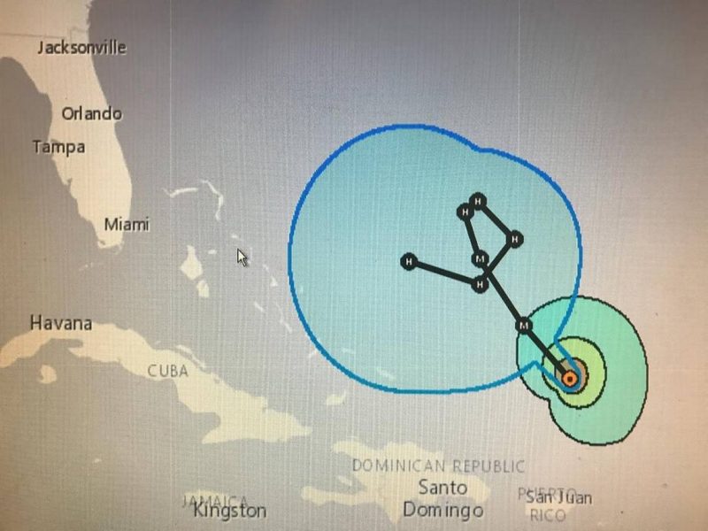 En su parte más reciente, el Centro Nacional de Huracane pronostica que José tendrá categoría 4 en los próximos cinco días al tomar un rumbo ligeramente al noreste, dar vuelta hacia el oeste, bajar hacia el sur y volver a tomar rumbo este, “como hacer un nudo”, dijo uno de los especialistas del Centro Nacional de Huracanes. (The Miami Herald)