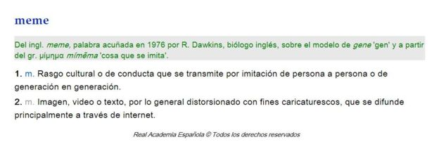 En su segunda acepción, lo define como “imagen, video o texto, por lo general distorsionado con fines caricaturescos, que se difunde principalmente a través de internet”.