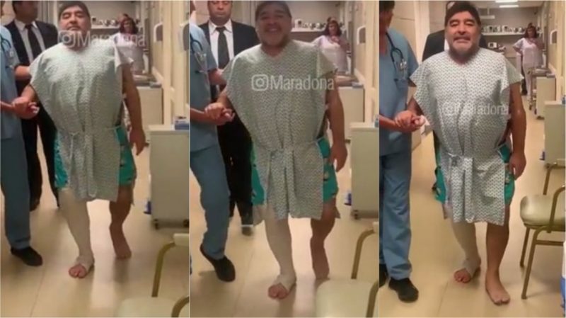 Acompañado por los médicos, el ex futbolista de 58 años dio sus primeros pasos en los pasillos de la clínica con una férula colocada en su pierna derecha, en la cual sufría sinovitis y una artrosis, según había informado su abogado y amigo, Matías Morla.