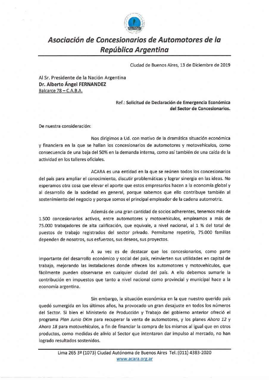 La Asociación de Concesionarias de Automotores (Acara) solicitó hoy al presidente Alberto Fernández la declaración de la emergencia económico-financiera por 365 días para la comercialización de autos, motos, camiones y buses a raíz de la “dramática situación” que atraviesa la actividad con una caída de hasta 50% de la demanda interna.