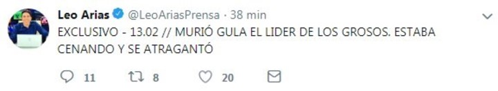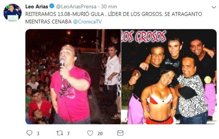 Una dura noticia para la movida tropical. El Gula, líder de la banda Los Grosos, murió de manera inesperada al atragantarse mientras cenaba. Lo informó el periodista de Crónica Leo Arias y luego lo confirmaron sus propios compañeros de la banda en su cuenta de Facebook.