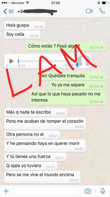 “Hola guapa, soy Celia, cómo estás”, le dice a Eva, que fue vinculada al político Argentino luego de Fuentes. “No, quedate tranquila, yo ya me separé, así que lo que haya pasado ya pasó”, le dice Eva luego de recibir un audio de la modelo.