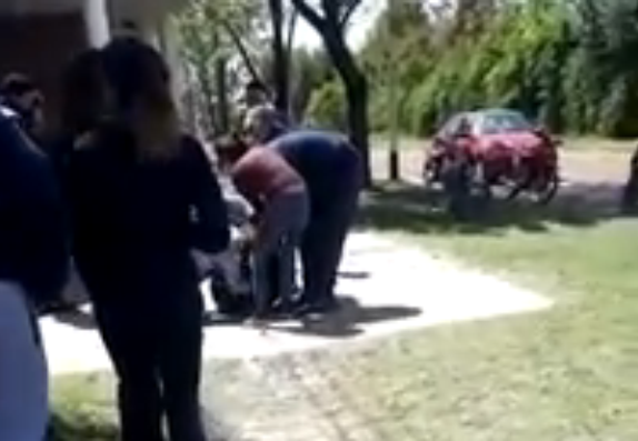 El hecho ocurrió el mediodía del último viernes en la entrada al Jardín público Nº 915 en el barrio de El Bajo y la pelea fue registrada por un testigo a través de su teléfono celular.