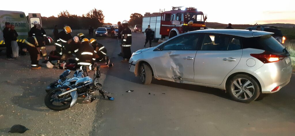 Tras el choque, el auto quedó atravesado en el medio de la ruta, mientras que a pocos metros y sobre la banquina quedó la moto. Cerca del rodado menor estaban tendidos los ocupantes del mismo.