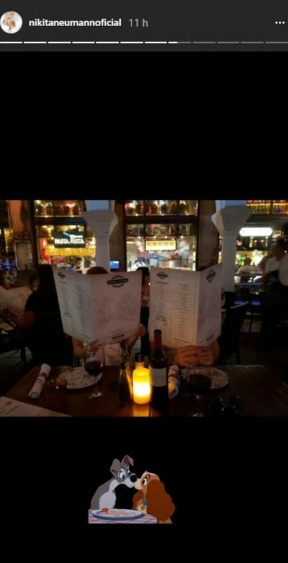 La foto elegida es una imagen un tanto tramposa ya que sólo se ven las manos de ambos sosteniendo las cartas de un restaurante mientras eligen sus comidas. Además de que el único indicio romántico que se ve en ella es un emoticón de La Dama y el Vagabundo que la modelo montó en esa historia.