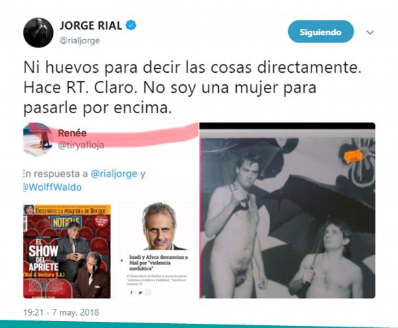 Al ver el retweet de Pettinato, Rial disparó durísimo contra el saxofonista. “Ni huevos para decir las cosas directamente. Hace RT. Claro. No soy una mujer para pasarle por encima”, escribió el periodista, sin vueltas junto a una foto del álbum Pachuco cadáver, en el que el músico está completamente desnudo.