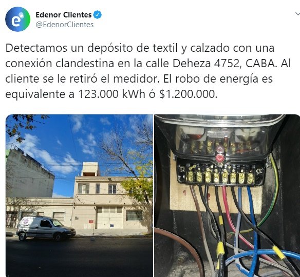 “Detectamos un depósito de textil y calzado con una conexión clandestina en la calle Deheza 4752, CABA. Al cliente se le retiró el medidor. El robo de energía es equivalente a 123.000 kWh ó $1.200.000“, informó Edenor