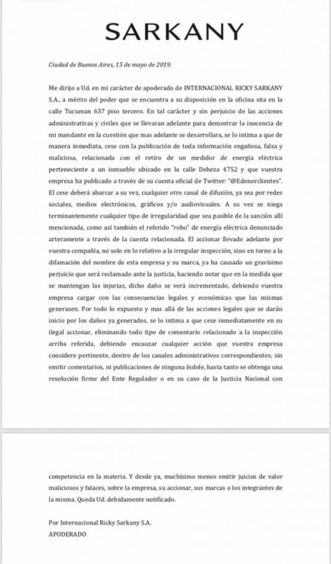 Ricky emitió un comunicado a través de su cuenta oficial. Este es el texto de la carta documento que recibirá el día jueves 16, @EdenorClientes como respuesta al mensaje difamatorio publicado el día de hoy.