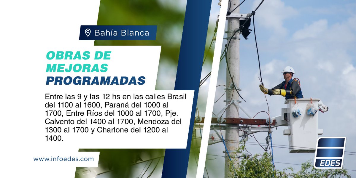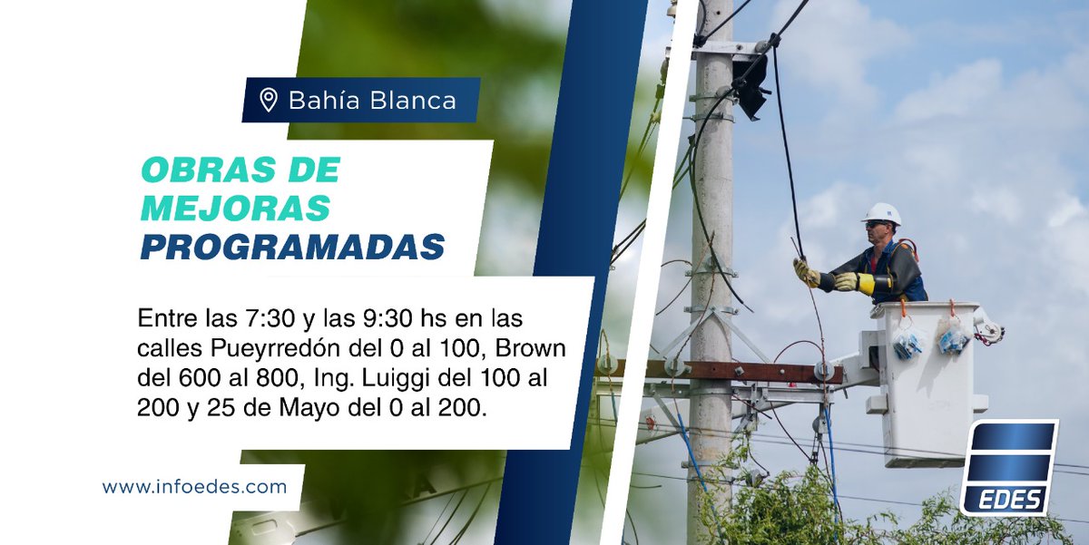 La empresa EDES anunció varios cortes de energía para este martes en la ciudad, por tareas de mejoras y mantenimiento.
