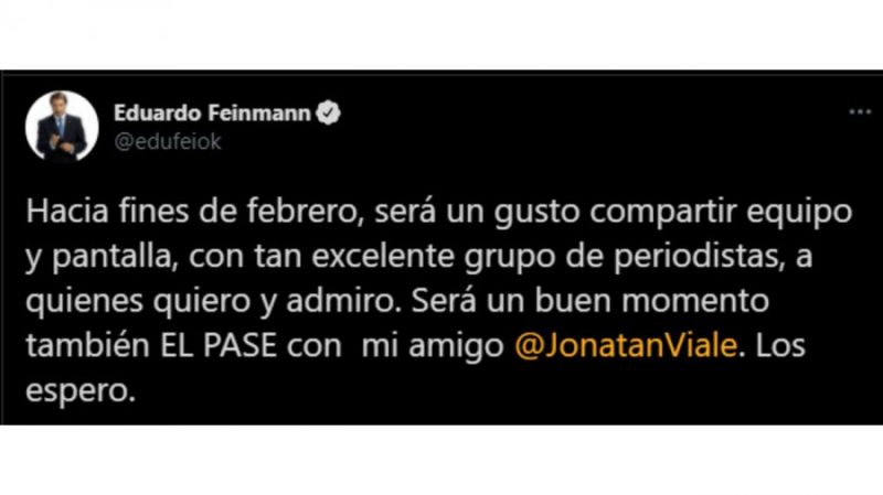 Hacia fines de febrero, será un gusto compartir equipo y pantalla, con tan excelente grupo de periodistas, a quienes quiero y admiro. Será un buen momento también el pase con mi amigo @JonatanViale. Los espero”, comunicó el presentador de televisión y radio en Twitter, confirmando así que ese momento se mudará desde A24 a LN+.