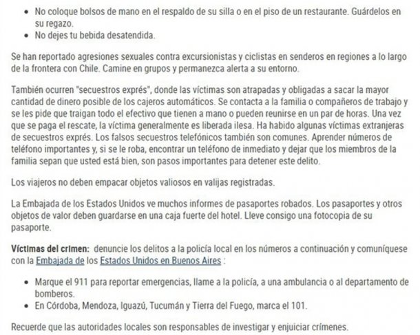 En este marco, el Departamento de Estado estadounidense recrudeció los consejos para aquellos que pisen suelo argentino y evitar asaltos, secuestros, estafas y hasta piquetes y manifestaciones.