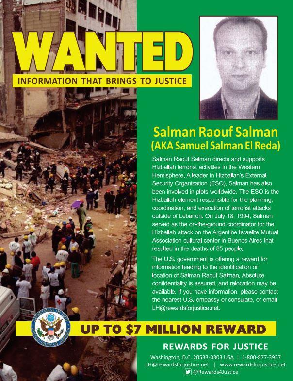 A su vez, el Departamento del Tesoro de Estados Unidos emitió sanciones contra Salman por “coordinar este devastador ataque” del 18 de julio de 1994 y dirigir, desde entonces, “operaciones terroristas para Hezbollah en el hemisferio occidental”, según indicó subsecretaria del Departamento del Tesoro para Terrorismo e Inteligencia Financieras, Sigal Mandelker.