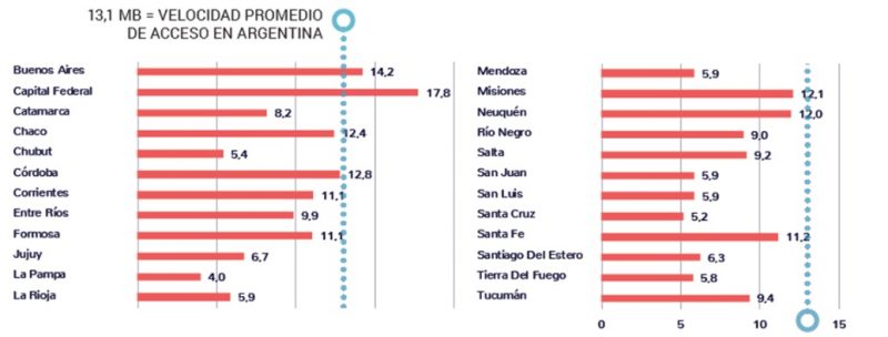 Si se analizan las velocidades promedio por provincia, solo la Ciudad y la provincia de Buenos Aires, con 17,8 y 14,2 MBrespectivamente, están por encima de la media nacional. El top 5 lo completa Córdoba con 12,8 MB, Chaco con 12,4 MB y Misiones con 12,1 MB.