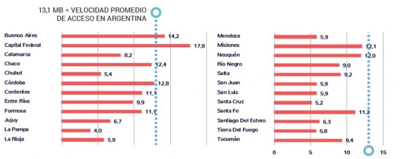 En el extremo opuesto, La Pampa tiene una velocidad promedio de 4 MB, Santa Cruz 5,2 y Chubut 5,4 megas.