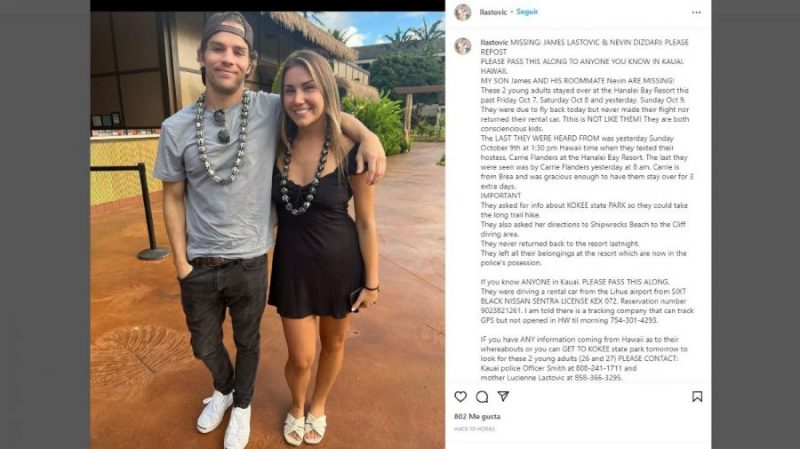 “Anoche no volvieron al complejo turístico. Dejaron todas sus pertenencias en el complejo, que ahora están en posesión de la policía. Si conoce a alguien en Kauai, por favor, comunique esto”, reza el posteo de la madre del actor, que ha volado desde San Diego a Hawai. “¡Esto no es propio de ellos!”, escribió en su pie de foto.