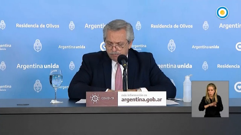 Fernández hizo el anuncio en la Residencia Presidencial de Olivos, acompañado por el gobernador de la provincia de Buenos Aires, Axel Kicillof, y el jefe de gobierno porteño, Horacio Rodríguez Larreta.