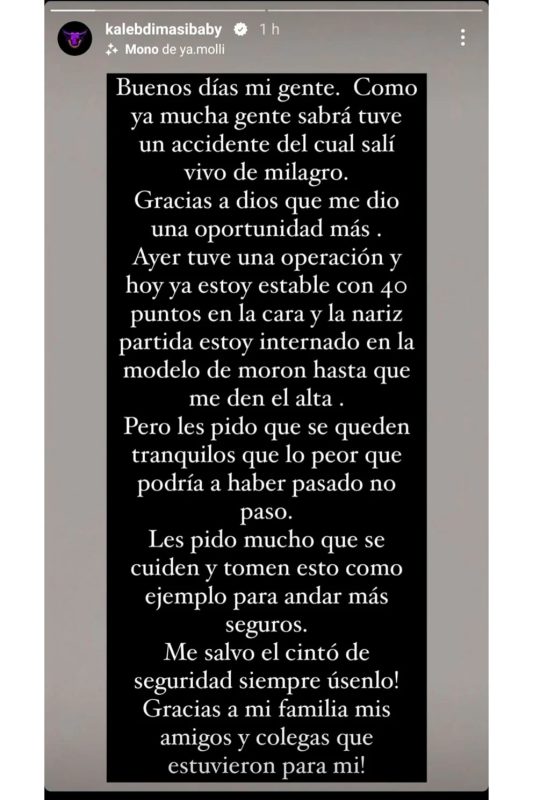 Las imágenes del choque se viralizaron en las redes cuando una fanática del músico las registró con su teléfono celular. La joven circulaba por la autopista y reconoció el auto de Kaleb que había impactado con el móvil policial. De inmediato, corrió la preocupación y la incertidumbre por la salud del músico, hasta que horas más tarde se manifestó en su cuenta oficial de Instagram.