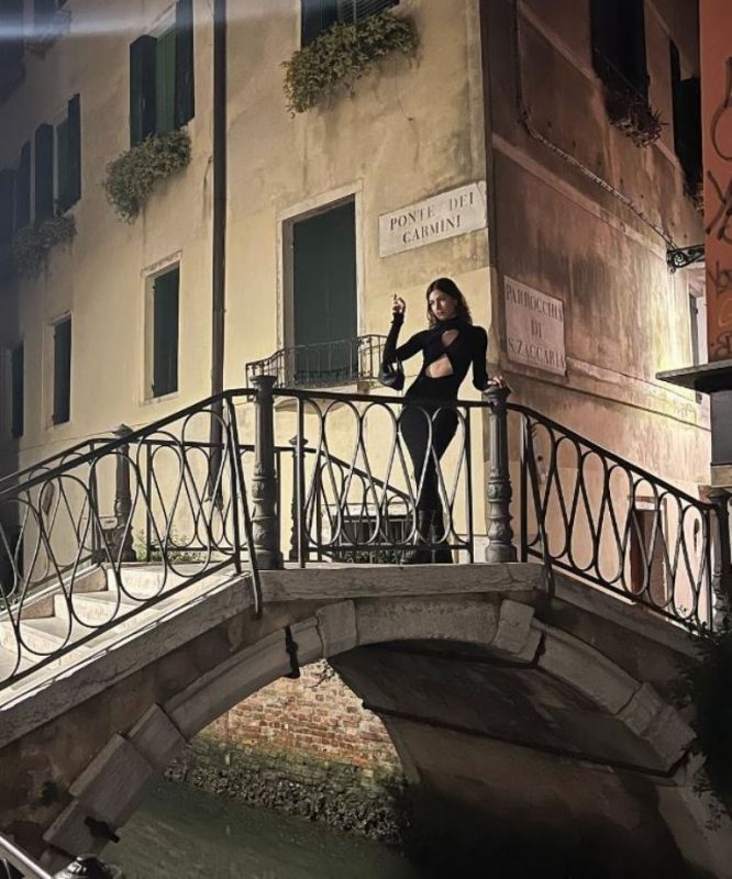 En otra de los posteos, el joven actor argentino mostró a su novia de noche, sobre un puente típico del lugar y con un vestido negro súper sensual que dejó ver que es una de las actrices españolas más bellas del mundo entero.