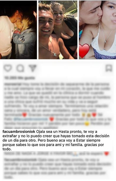 Con un posteo en las redes sociales y un collage de fotos juntos, la mediática informó su separación del jugador. Si bien dio a entender que todo quedó en buenos términos, horas más tarde borró la respuesta del joven que la responsabilizaba de tomar la decisión “de un día para el otro”.