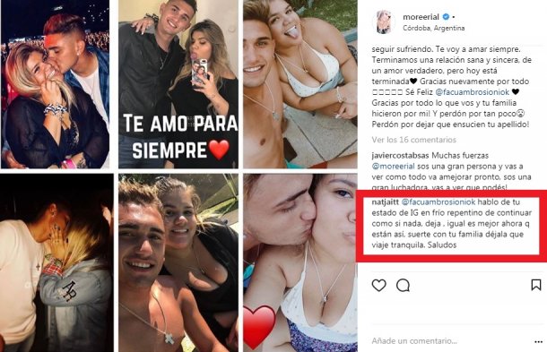 Según dio a entender More, hubo un pequeño cruce entre Natacha y Facundo que fue quitado de la publicación y terminó con un misterioso mensaje de Jaitt: “Hablo de tu estado de IG en frío repentino de continuar como si nada, deja , igual es mejor ahora que están así, suerte con tu familia déjala que viaje tranquila. Saludos”.