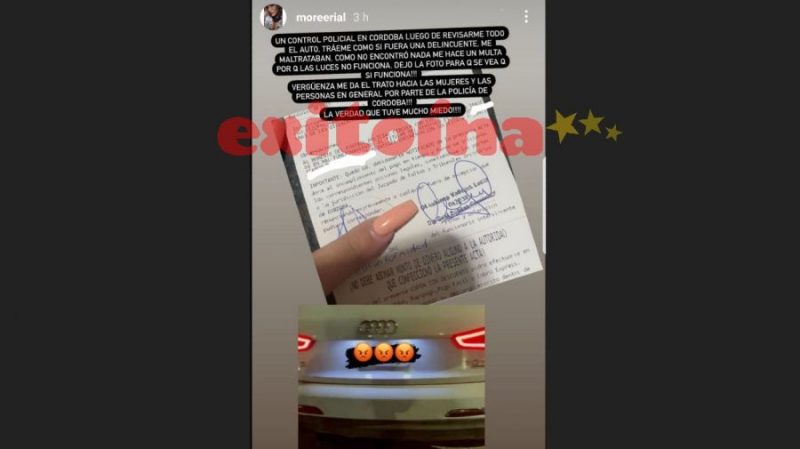 Un control policial en Córdoba, luego de revisarme todo el auto. Tratarme como si fuera una delincuente. Me maltrataban“, escribió Morena en una historia de Instagram donde mostró la multa que recibió por supuestamente tener las luces traseras sin funcionar. Sin embargo, la hija de Jorge Rial confirmó en la misma captura que las luces funcionaban correctamente.