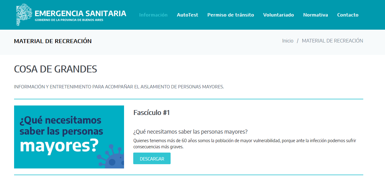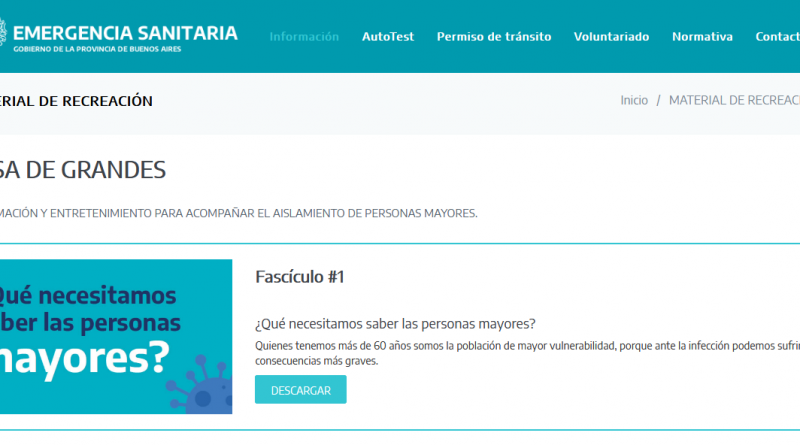 Ya están disponibles el fascículo #1 “COVID-19. Qué necesitamos saber las personas mayores”; el fascículo #2 “La vida cotidiana de las personas mayores en tiempos de coronavirus” y el fascículo # 3 “¿Cómo nos sentimos las personas mayores durante el aislamiento? Se pueden descargar desde https://portal-coronavirus.gba.gob.ar/es/material-de-recreacion