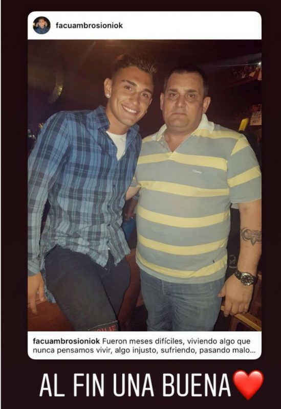 Facundo compartió una foto con su padre acompañada de un extenso descargo. “Fueron meses difíciles, viviendo algo que nunca pensamos vivir, algo injusto, sufriendo, pasando malos momentos, angustias, etc. La gente muchas veces critica, opina, habla, juzga sin conocer , sin saber, etc. Pero gracias a dios terminó esta pesadilla que estábamos viviendo viejo siempre recordad que dios le da las peores batallas a sus mejores guerreros. Ahora a empezar a vivir y a disfrutar como siempre lo hicimos ahora mas que nunca. Te amo papá. Gracias amor por haberme acompañado en este momento que no se lo deseo a nadie, por siempre haberme sacado una sonrisa, te amo @moreerial. Gracias hijo. Gracias dios volviste gordo, te tenemos con nosotros. Feliz”, expresó el joven.