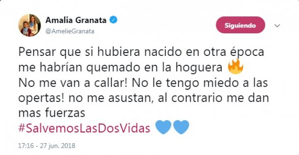 En otro mensaje, Amalia habló de “operetas” y censura: “Pensar que si hubiera nacido en otra época me habrían quemado en la hoguera. ¡No me van a callar! ¡No le tengo miedo a las opertas! No me asustan, al contrario, me dan más fuerzas #SalvemosLasDosVidas”, expresó.