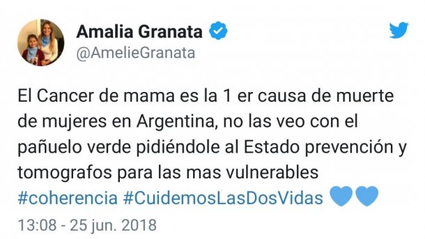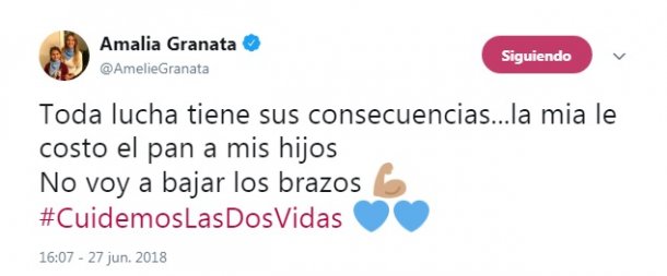 Amalia Granata fue despedida de Canal 9, donde se desempeñaba como panelista en el programa Todas las tardes, conducido por Maju Lozano. El motivo fue un polémico tuit contra la despenalización del aborto y la concientización de la detección temprana del cáncer de mamá, a horas de conocerse la muerte de Geñi Laprida, hija de María Eugenia, una de las Trillizas de Oro.