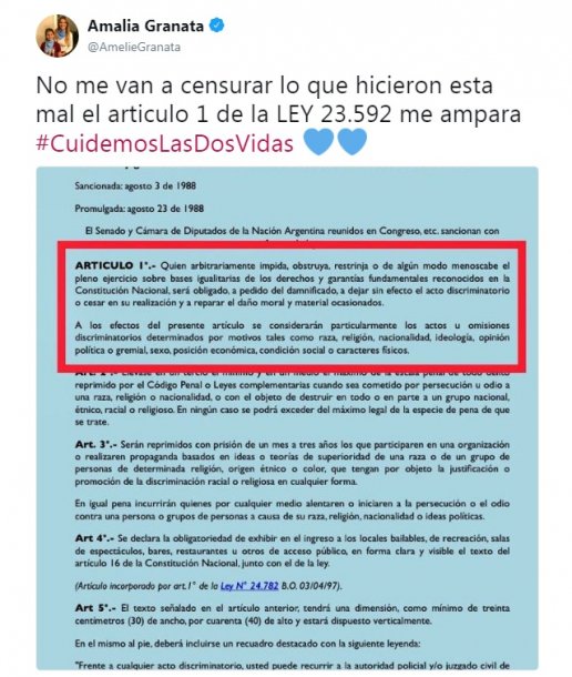 “No me van a censurar lo que hicieron está mal el artículo 1 de la LEY 23.592 me ampara”, indicó y publicó un fragmento de la Ley de Penalización de actos discriminatorios.