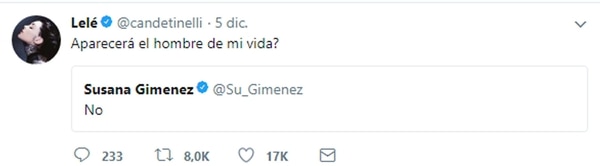 Días atrás, había bromeado con el fallido tuit de Susana Giménez con la palabra “No” y se preguntó: “¿Aparecerá el hombre de mi vida?”.
