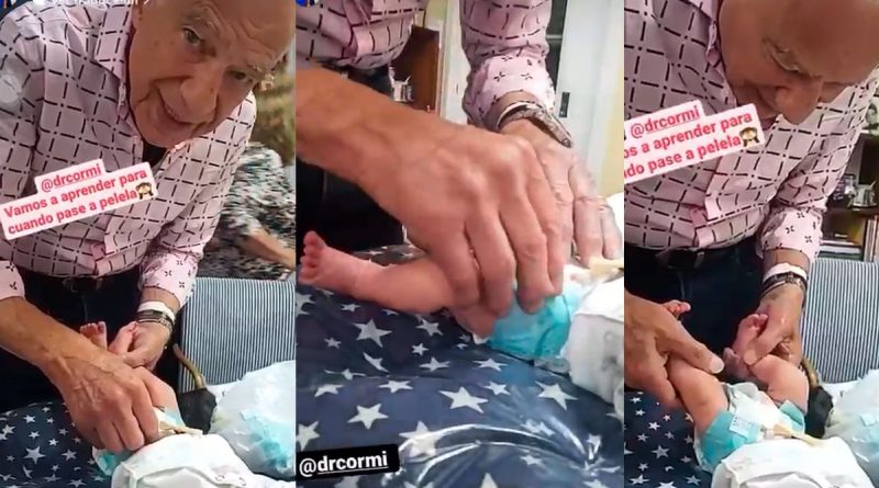 Ya en su casa junto a su mujer y su bebé, Cormillot fue grabado mientras le cambiaba los pañales al nene. Cabe recordar que él no realizaba esta actividad desde el nacimiento de Adrián, su otro hijo que hoy tiene 42 años.
