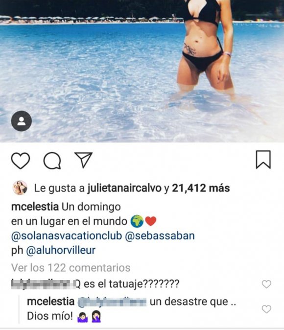 ¿El motivo? Un gran tattoo que Celeste tiene en su abdomen: “¿¿Qué es el tatuaje??”, preguntó la usuaria. Y ella respondió con total honestidad: “Un desastre que… ¡Dios mío!”.
