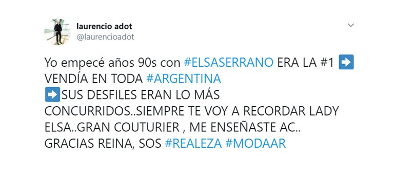 Consternada con esta triste noticia. Elsa Serrano fue una gran precursora de la moda. Hizo vestidos icónicos que recordaremos por siempre. Mi más sentido pésame a toda su familia y amigos. #QEPD pic.twitter.com/kzoiM7SXEL