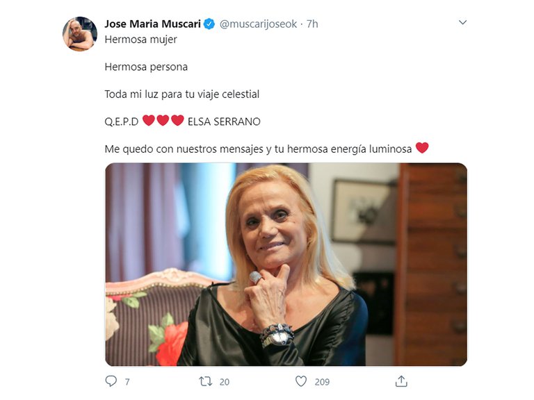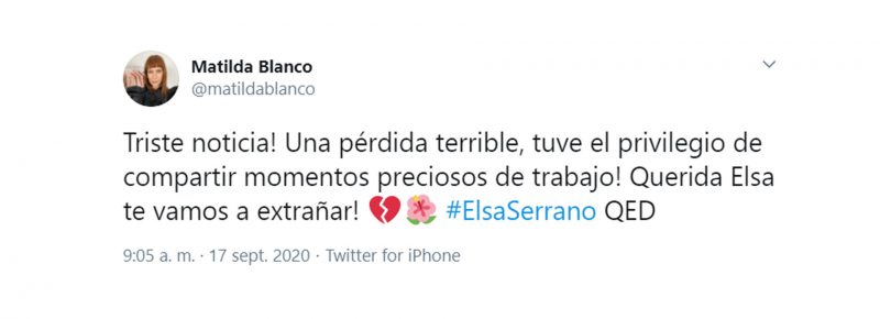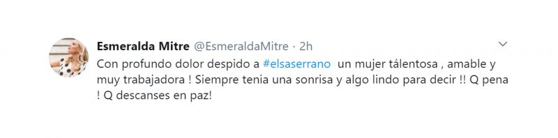 “Querida Elsa, qué tristeza enorme siento con tu dolorosa tragedia“, escribió en su cuenta de Twitter Andrea Politti, conductora del programa Corte y confección, envío donde Serrano había hecho su última aparición pública en los medios.