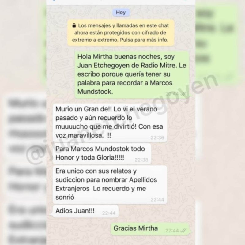 El periodista de radio Mitre Juan Etchegoyen compartió en su cuenta de Twitter una captura del chat que tuvo con Mirtha. “Murió un grande. Lo vi el verano pasado y aún recuerdo lo mucho que me divirtió. ¡Con esa voz maravillosa!“, escribió la diva.