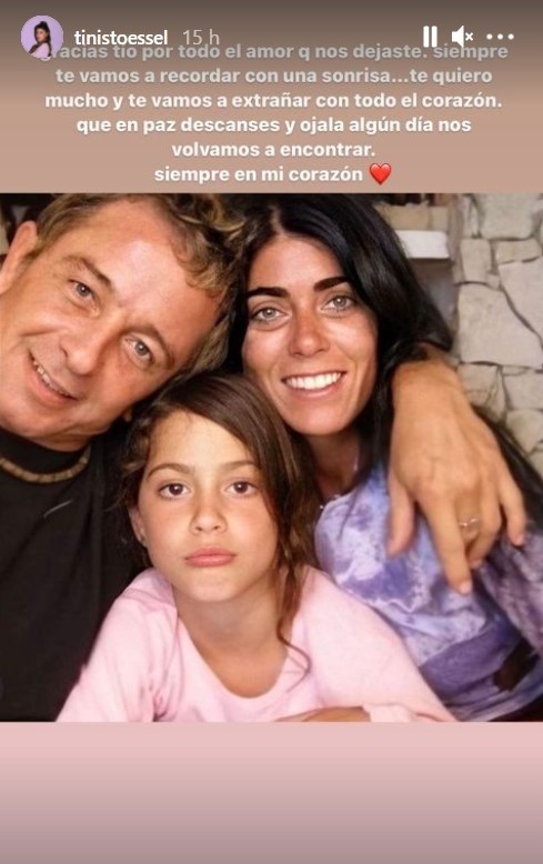 En sus historias de Instagram, la cantante escribió un conmovedor mensaje: “Gracias, tío, por todo el amor que nos dejaste. Siempre te vamos a recordar con una sonrisa… te quiero mucho y te vamos a extrañar con todo el corazón. Que en paz descanses y ojalá algún día nos volvamos a a encontrar. Siempre en mi corazón“.